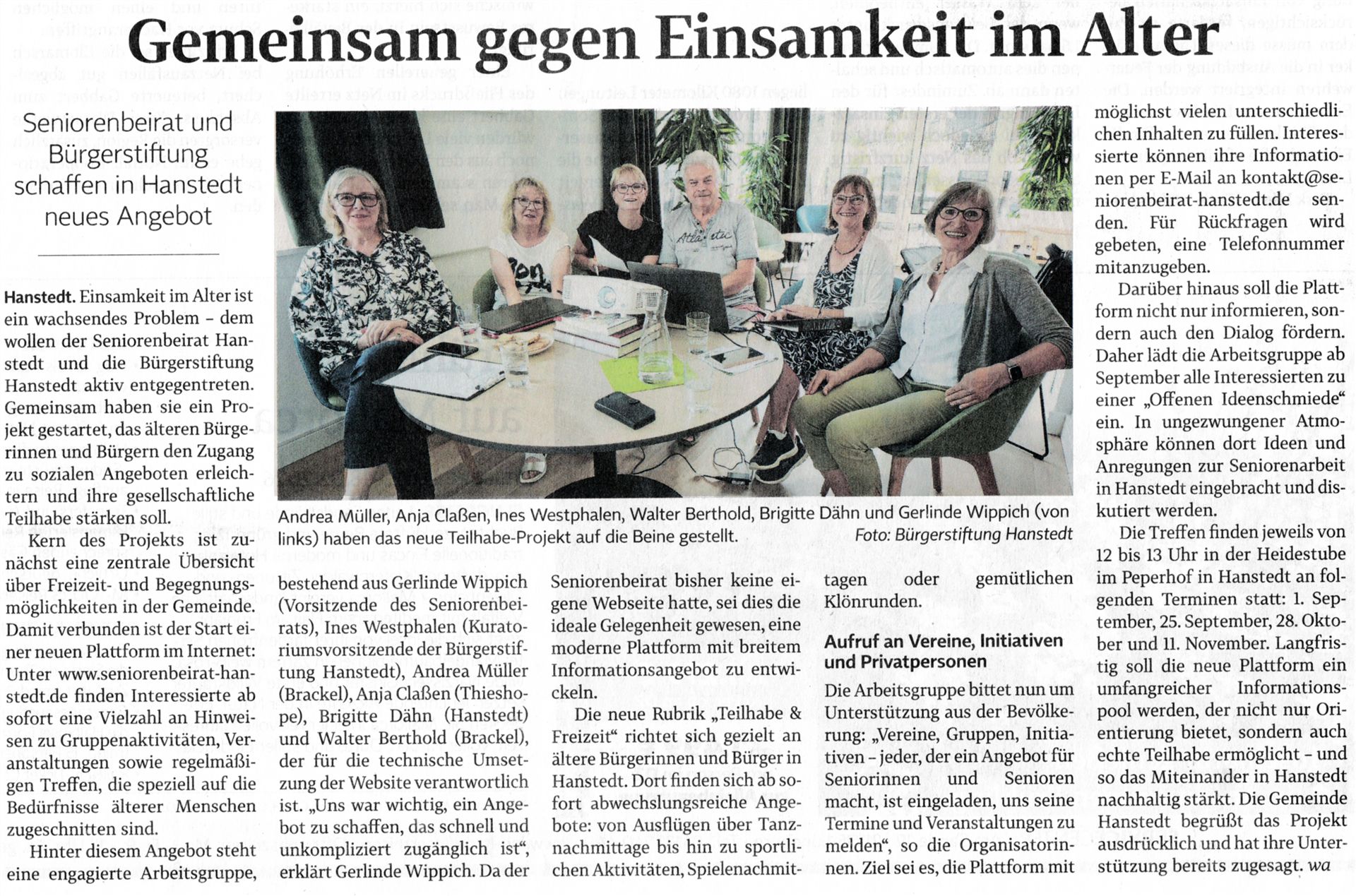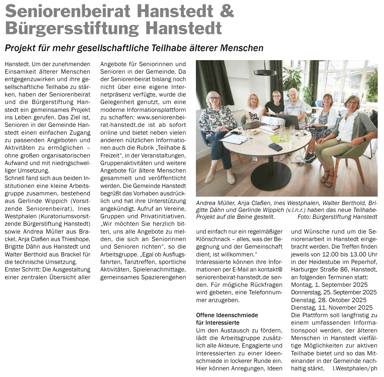 Hier finden Sie aktuelle Pressemitteilungen, Interviews, Presseerklärungen und Veröffentlichungen des Seniorenbeirates Hanstedt.