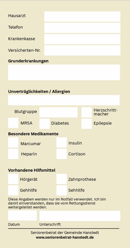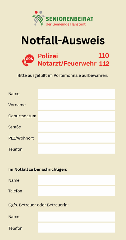 Mit einem ebenso praktischen wie lebensnahen Projekt startet der Seniorenbeirat Hanstedt ins Neue Jahr. Der Seniorenbeirat bietet nun den sogenannten Notfallpass an, ein kleines Dokument im handlichen Scheckkartenformat, das künftig vielen Seniorinnen und Senioren zusätzliche Sicherheit geben soll.